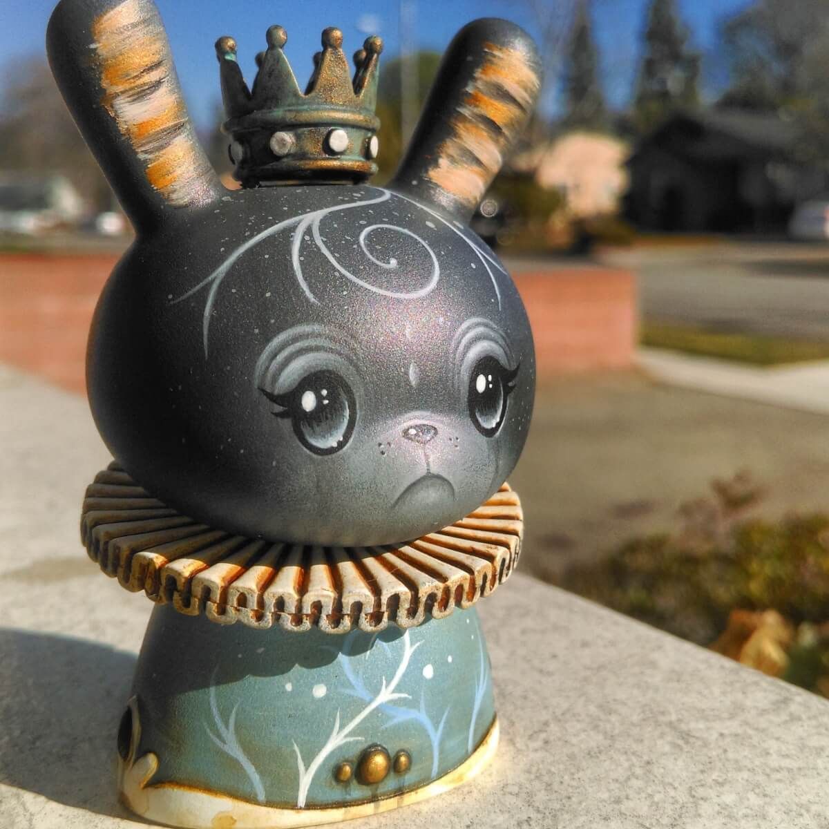 The toy is based on a rabbit figure with distinctive tubular ears. The origin of the name Dunny came from a combination of street slang and one of the early "Devil Bunny" prototypes. The Dunny is sold in four sizes - 3", 5", 8" and 20". The toy has three points of articulation; a 360 degree rotational head and two arms. An artist card or sticker is also included with the 3" Dunny from a series. Most 3" Dunnys and some 8" Dunnys are normally sold as "blind assortment"; the figure is packaged inside a sealed foil wrapper, such that the buyer is not able to see which figure and accessories they are buying. Sealing the figure prevents people from opening and peeking in the boxes and buying only the figures they want. Most Dunnys are packaged inside a clear plastic bag in addition to the foil wrapper. In the second-hand market, this assures the buyer that the article was never on display and is in a "new" condition. With the success of vinyl toys as a medium for expression, many fans and artists have put their own design onto blank Dunnys. Raised in Dronfield in the United Kingdom, Squink! grew up on a diet of popcorn, candy, and Jayce and the wheeled warriors. Qualified as a graphic designer but also a keen painter from a very early age, he became a toy collector with the launch Of the Toy2R Qee, which eventually lead to customising everything he could get his hands on! A head filled with characters in need of being set free finally had an outlet. Heavily influenced by japanese culture and 80’s cartoons, he claims to put a little bit of his soul into each character he creates, giving them all a unique personality, fueled by coffee, good smelly cheese and shoegaze. Gathering inspiration from the toys and natural forms he surrounds himself with. Squink! has more recently branched out into canvas paintings, and also limited edition screen printed t-shirts.