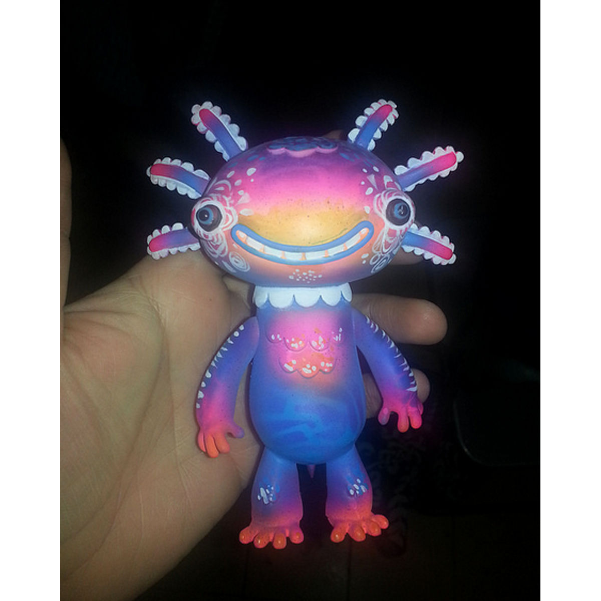 Self-produced art toys are designer collectibles created and manufactured independently by the artist or small teams without the backing of a large toy company or mass-market brand. These toys are often highly personal, artistic expressions and are usually made in limited runs. Key Characteristics include independent creation where the artist is in control of the entire process from concept, sculpting, and painting to production and packaging. These are usually made in small batches, often 10–100 pieces, which adds to their rarity, made using materials like resin, sofubi (Japanese soft vinyl), or 3D-printed components. Frank Mysterio is a Mexican artist and designer known for his bold, psychedelic, and graffiti-inspired art toys. His work blends elements of Mexican folklore, lucha libre, lowbrow art, and street culture, resulting in eye-catching, highly detailed designs that often feature skulls, masks, and intricate patterns. Mysterio is particularly recognized for his use of bright neon colors, airbrushed gradients, and tattoo-like linework, giving his figures a unique and unmistakable aesthetic. He frequently customizes sofubi (soft vinyl) toys, adding his signature artistic flair to established platforms while also creating original designs. His work has gained international recognition in the designer toy scene, leading to collaborations with various toy companies and artists. Mysterio’s fusion of Mexican traditions with contemporary urban art makes him a standout figure in the global art toy movement. Sofubi toy Created and designed by Gary Ham Sculpted by Chauskoskis