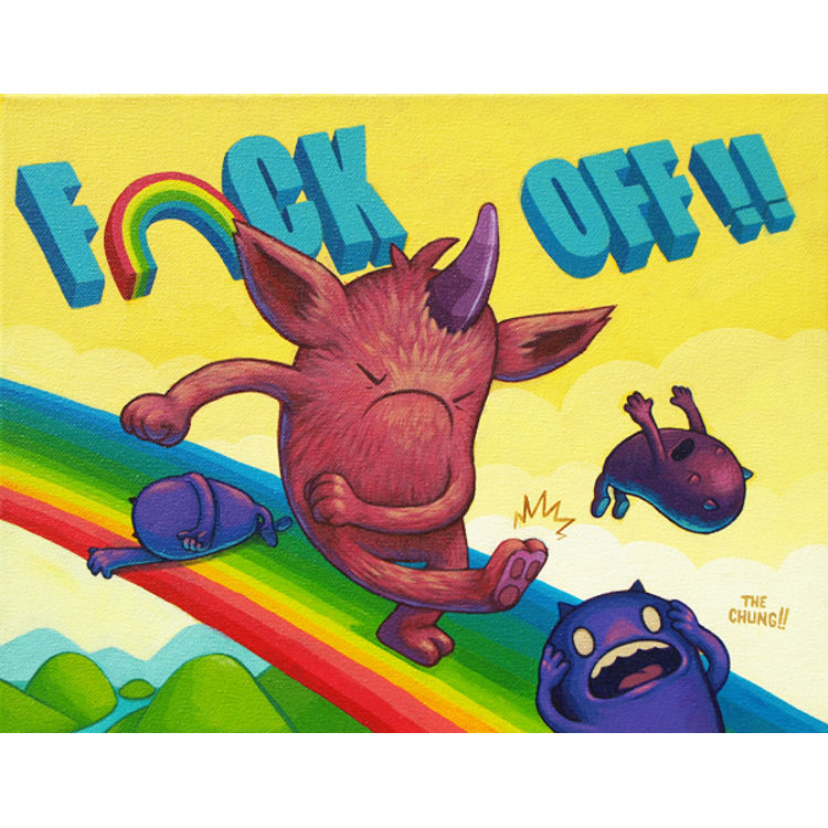 Like a sledgehammer to your funny bone, The Chung!! uses his unique brand of off-beat humor to examine the inevitable misfortunes and disappointments that accompany all of our lives and finds a glimmering ray of light therein. His work reminds us to step back, stop taking ourselves so seriously, and use the moment to laugh at our failures, because after all, feeling sorry for ourselves never got anyone anywhere. David Chung, affectionately known as The Chung!!, lives in Los Angeles yet works out of some dark, strange corner of the human imagination that the rest of us generally knows to stay away from. His artwork, filled with humor and awkwardness, is a sort of catharsis for the moments of humiliation which inevitably stain all of our lives. The Chung!! has shown in galleries all over Los Angeles, New York, Hong Kong, Taiwan, and parts of Europe. He currently works full time during the day as a Background Designer for Nickelodeon and a fine artist by night. Acrylic paint is fast drying paint containing pigment suspension in acrylic polymer emulsion. Acrylic paints can be diluted with water, but become water-resistant when dry. Depending on how much the paint is diluted (with water) or modified with acrylic gels, media, or pastes, the finished acrylic painting can resemble a watercolor or an oil painting, or have its own unique characteristics not attainable with other media.