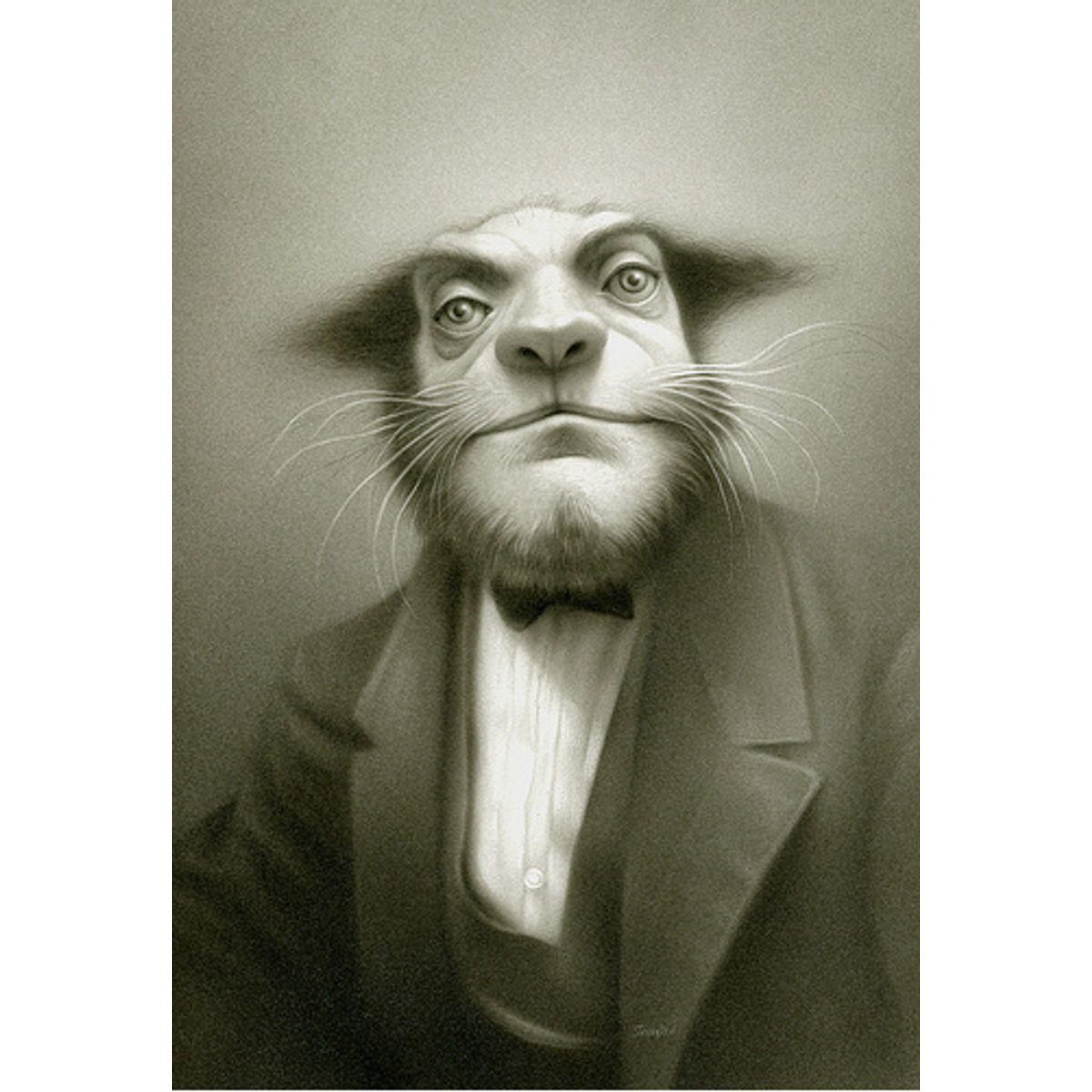 Travis Louie’s paintings come from the tiny little drawings and many writings in his journals. He’s created his own imaginary world that is grounded in Victorian and Edwardian times. It is inhabited by human oddities, mythical beings, and otherworldly characters who appear to have had their formal portraits taken to mark their existence and place in society. The underlining thread that connects all these characters is the unusual circumstances that shape who they were and how they lived. Some of their origins are a complete mystery while others are hinted at. A man is cursed by a goat, a strange furry being is discovered sleeping in a hedge, an engine driver can’t seem to stop vibrating in his sleep, a man overcomes his phobia of spiders, etc, . . .Using inventive techniques of painting with acrylic washes and simple textures on smooth boards, he’s created portraits from an alternate universe that seemingly may or may not have existed. Acrylic paint is fast drying paint containing pigment suspension in acrylic polymer emulsion. Acrylic paints can be diluted with water, but become water-resistant when dry. Depending on how much the paint is diluted (with water) or modified with acrylic gels, media, or pastes, the finished acrylic painting can resemble a watercolor or an oil painting, or have its own unique characteristics not attainable with other media.