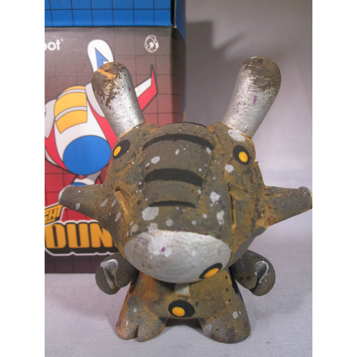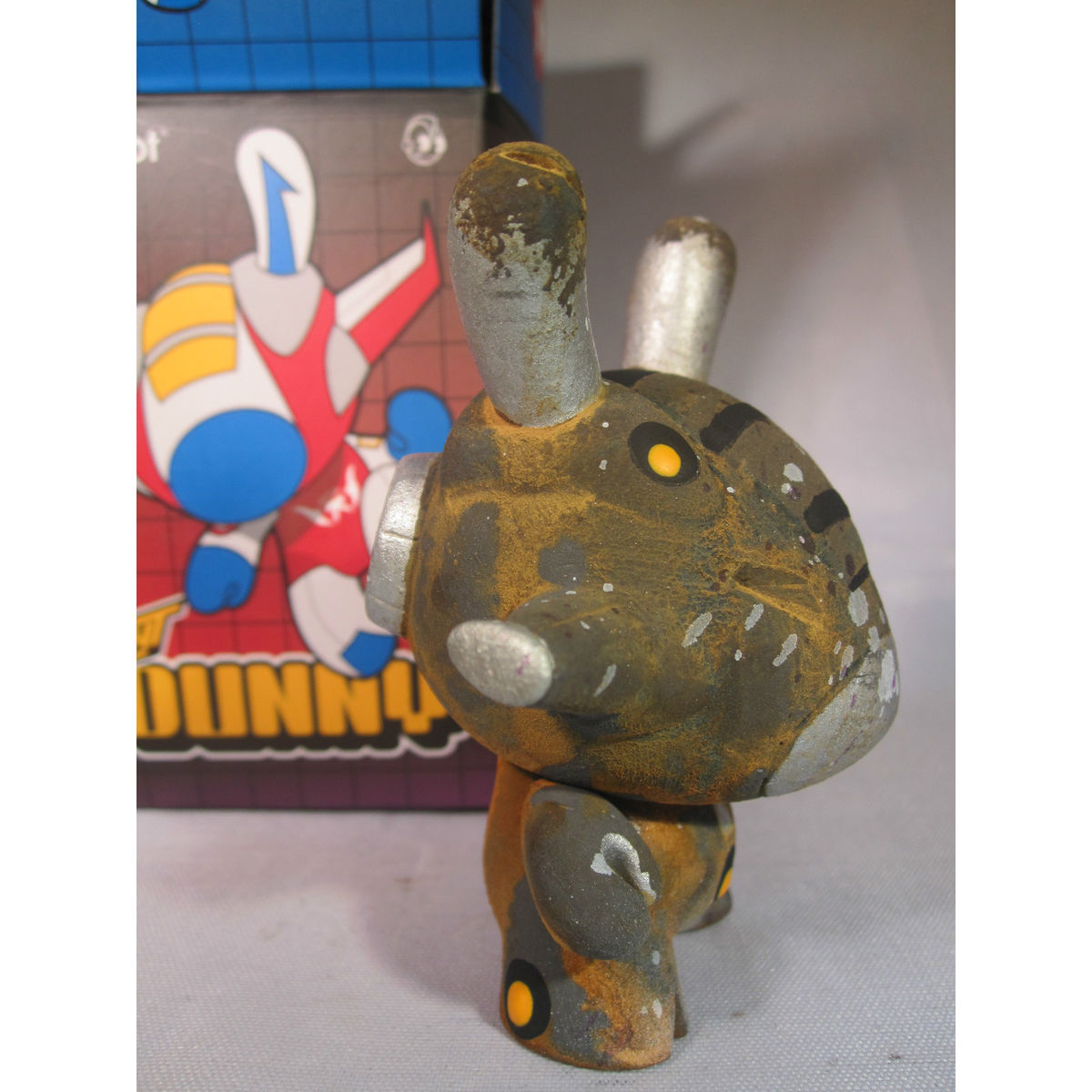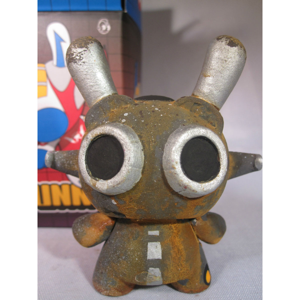 The toy is based on a rabbit figure with distinctive tubular ears. The origin of the name Dunny came from a combination of street slang and one of the early "Devil Bunny" prototypes. The Dunny is sold in four sizes - 3", 5", 8" and 20". The toy has three points of articulation; a 360 degree rotational head and two arms. An artist card or sticker is also included with the 3" Dunny from a series. Most 3" Dunnys and some 8" Dunnys are normally sold as "blind assortment"; the figure is packaged inside a sealed foil wrapper, such that the buyer is not able to see which figure and accessories they are buying. Sealing the figure prevents people from opening and peeking in the boxes and buying only the figures they want. Most Dunnys are packaged inside a clear plastic bag in addition to the foil wrapper. In the second-hand market, this assures the buyer that the article was never on display and is in a "new" condition. With the success of vinyl toys as a medium for expression, many fans and artists have put their own design onto blank Dunnys.