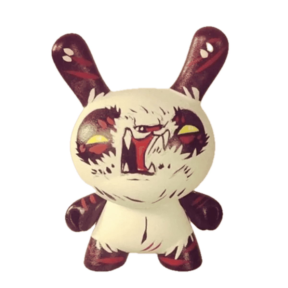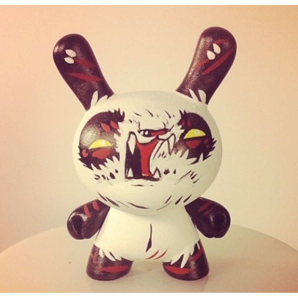 The toy is based on a rabbit figure with distinctive tubular ears. The origin of the name Dunny came from a combination of street slang and one of the early "Devil Bunny" prototypes. The Dunny is sold in four sizes - 3", 5", 8" and 20". The toy has three points of articulation; a 360 degree rotational head and two arms. An artist card or sticker is also included with the 3" Dunny from a series. Most 3" Dunnys and some 8" Dunnys are normally sold as "blind assortment"; the figure is packaged inside a sealed foil wrapper, such that the buyer is not able to see which figure and accessories they are buying. Sealing the figure prevents people from opening and peeking in the boxes and buying only the figures they want. Most Dunnys are packaged inside a clear plastic bag in addition to the foil wrapper. In the second-hand market, this assures the buyer that the article was never on display and is in a "new" condition. With the success of vinyl toys as a medium for expression, many fans and artists have put their own design onto blank Dunnys. Aaron “Angry Woebots” Martin was born on the Hawaiian Island of Oahu, but spent most of his childhood growing up and moving from Southern California to Nevada before finally landing back into Hawaii during his Junior year in high school. In 1999 while a car accident changed everything; this life-threatening experience inspired him to leave the island once again, this time to Seattle, Washington. Inspired by the rain and being indoors, he started playing around with different art mediums again. He then left back to Hawaii with a new perspective. “Being close to death, being trapped in metal changed everything. Almost eleven years later but its just like it happened yesterday life’s been unbelievable I been blessed with the best Family and Homies ever, on top of that I been rocking out full time doing what I love just painting and meeting the coolest people.” Aaron had his first show in 2002 and has not stopped. Showing in galleries up and down California the east coast, have even showed in shows that have traveled from the United States, Tokyo to Hong Kong, Australia, Thailand & New Zealand. Aaron has worked with companies & crews like Mind Style toys/Disney, Blue Scholars,