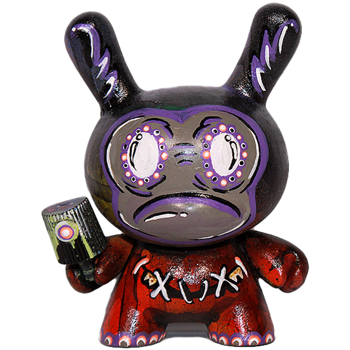 The toy is based on a rabbit figure with distinctive tubular ears. The origin of the name Dunny came from a combination of street slang and one of the early "Devil Bunny" prototypes. The Dunny is sold in four sizes - 3", 5", 8" and 20". The toy has three points of articulation; a 360 degree rotational head and two arms. An artist card or sticker is also included with the 3" Dunny from a series. Most 3" Dunnys and some 8" Dunnys are normally sold as "blind assortment"; the figure is packaged inside a sealed foil wrapper, such that the buyer is not able to see which figure and accessories they are buying. Sealing the figure prevents people from opening and peeking in the boxes and buying only the figures they want. Most Dunnys are packaged inside a clear plastic bag in addition to the foil wrapper. In the second-hand market, this assures the buyer that the article was never on display and is in a "new" condition. With the success of vinyl toys as a medium for expression, many fans and artists have put their own design onto blank Dunnys.